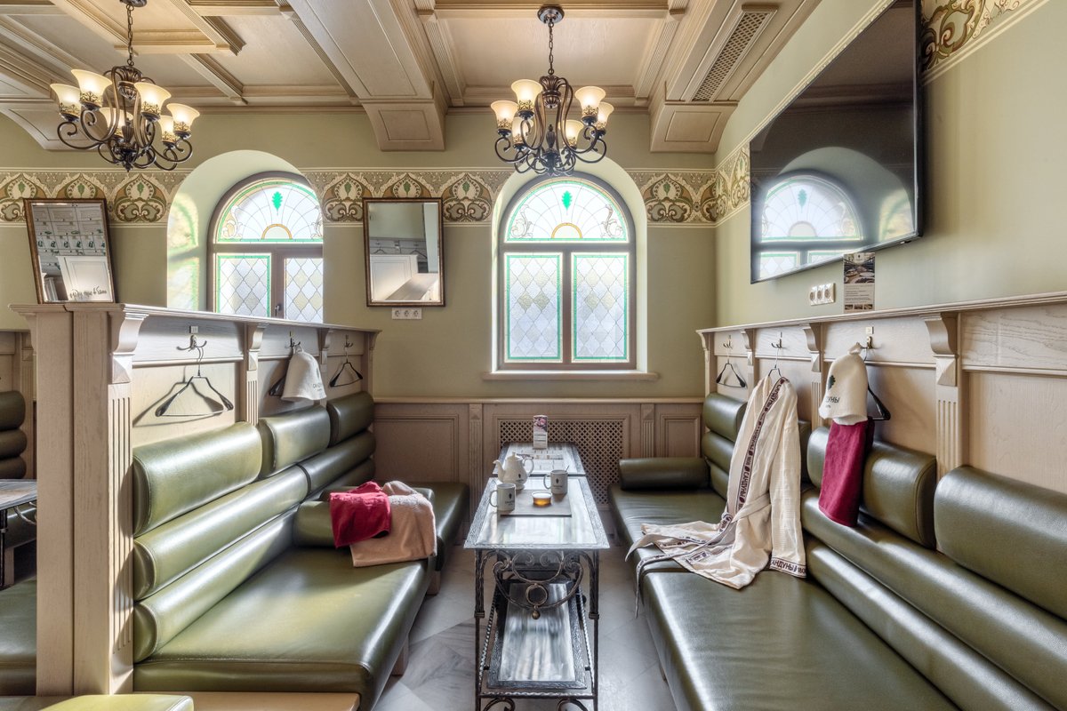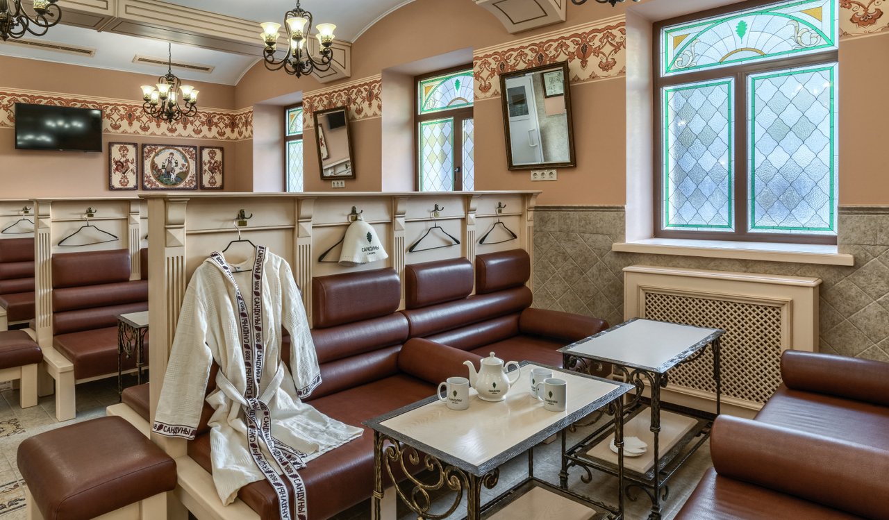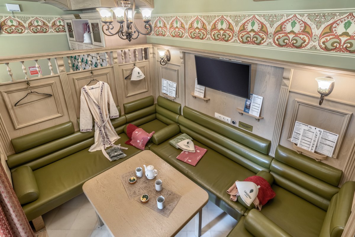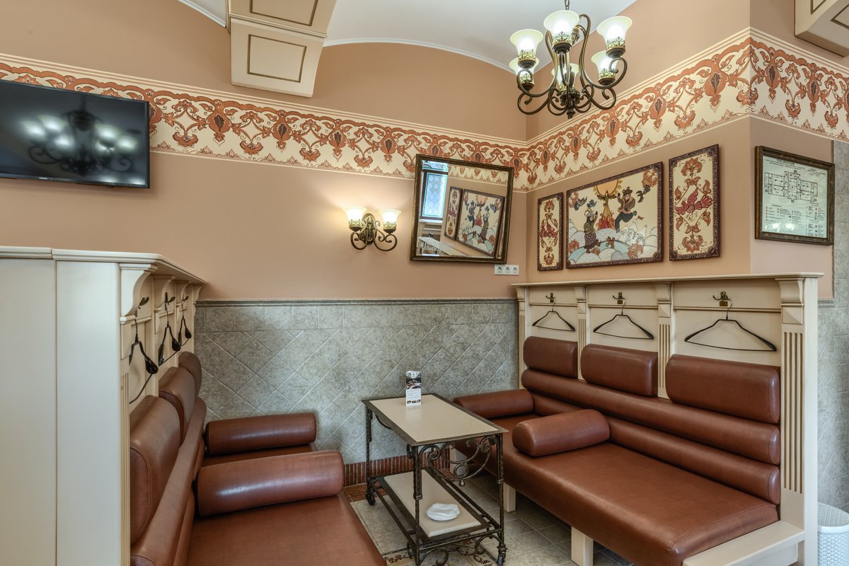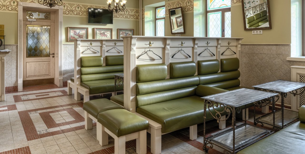 Не хочется в бассейн? Не проблема! Вместо этого можно посидеть в нашей комнате отдыха. Мы постарались создать здесь комфортный, стильный интерьер из максимально натуральных, экологичных материалов, выбрать мебель, которая будет одновременно удобной и красивой. Надеемся, что вам понравится! Также у нас работает бар, где вы можете заказать блюда русской кухни. Только не забывайте, что плотная трапеза непосредственно перед посещением парной - это не самая хорошая идея, согласно мнению врачей. А вот после парной она совсем не повредит!